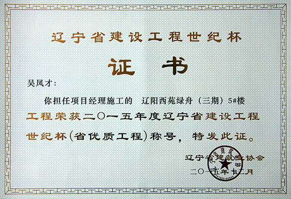 • 2015年遼寧省建設(shè)工程世紀(jì)杯(個(gè)人獎(jiǎng))